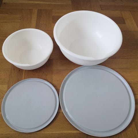 5 kpl vihreä-valkoisia kulhoja. Kahdessa kulhossa lohkeamat.
