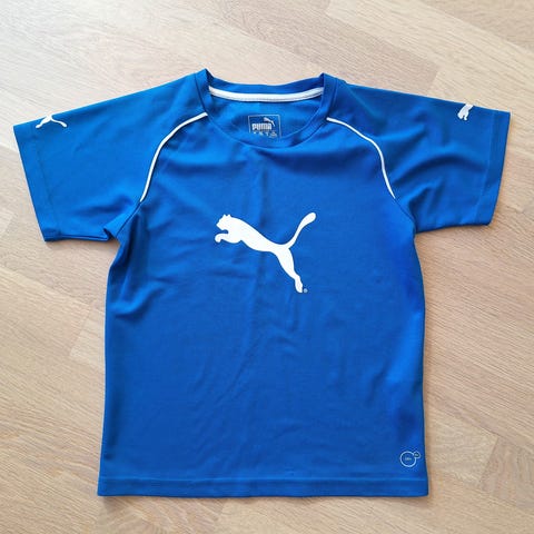 Puma tekninen t-paita, koko 128cm ja Puma liikuntacaprit, koko 128cm.