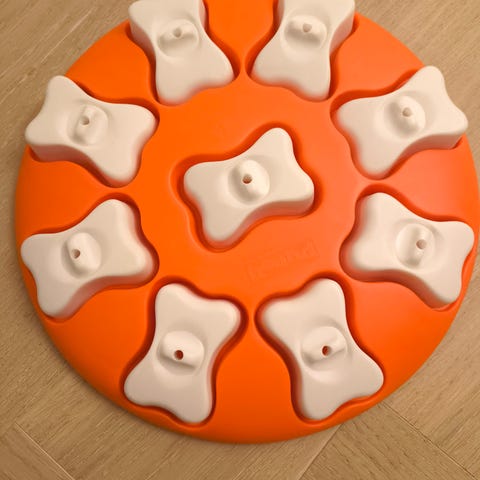 Interaktiivinen älypeli kaikenikäisille koirille. Koloihin saa piilotettua herkkuja ja ne saa esiin työntämällä liukuvia kappaleita ja nostamalla punaisesta nupista kannen ylös. Vaikeustasoltaan ei kovin vaativa. Mukavaa puuhaa koiran aktivointiin.