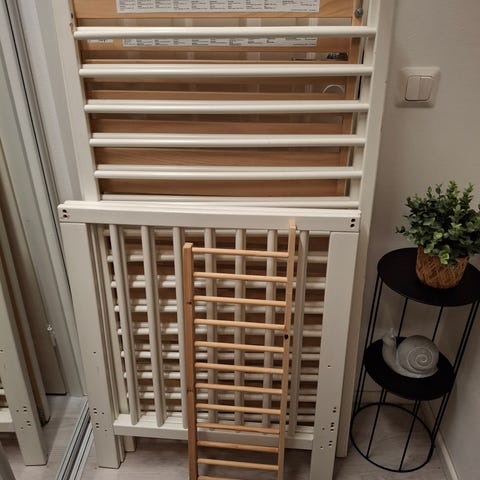 Kahdella lapsella käytössä ollut pinnasänky Ikea Gulliver. Yhden laidan saa pois myöhempää käyttöä varten, kuten kuvassa. Myös alkuperäinen korkea laita ja Vikare erikseen hankittu lisälaita mukaan. Patjan saa myös halutessaan mukaan, jotain tahroja, mutta käsittääkseni pestävällä päällisellä.