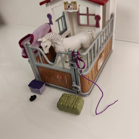 Myydään ihana schleich hevostalli, hevonen, varsa, hahmo, loimi ja koira. Hyvässä kunnossa, hepalla ja hahmolla jo leikitty enemmän mutta talli ja muut oikein hyvässä kunnossa. Toki pientä leikin jälkeä näkyy.