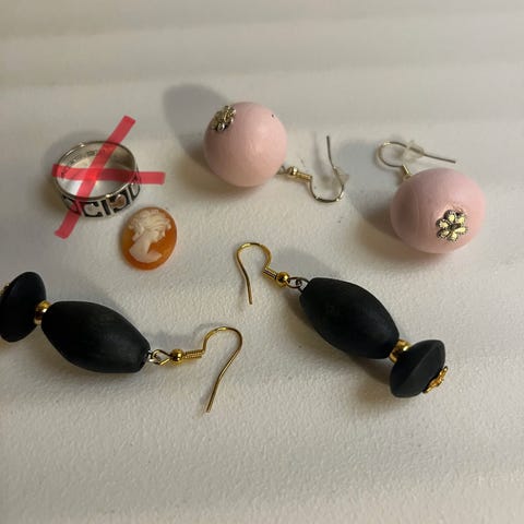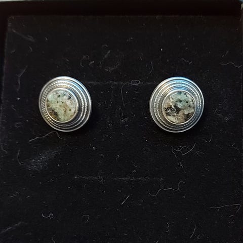 Kuvan pariton Kalevala Korun korvakoru. Börje Rajalin pronssi & vihreäkivi. Kk:n alkuperäinen tausta puuttuu.