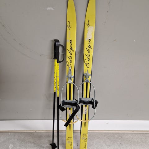 Muumi lasten sukset, kiinnitetään omiin kenkiin. Sauvat 80 cm. Nimikoitu.