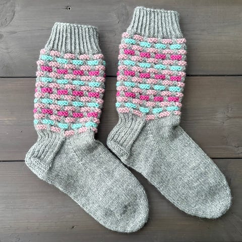 Pohjepituiset villasukat Novita 7veljestä langasta. Lappiaiheinen kuvio. Koko 39-40. Sopii esim hiihtosukaksi.