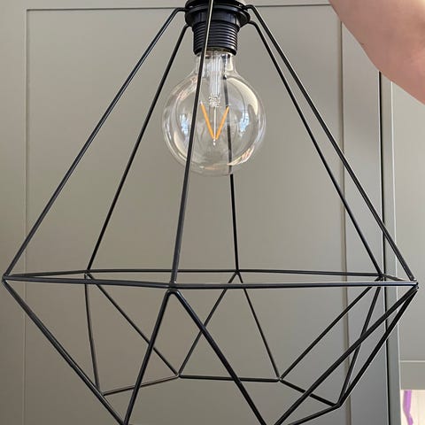 Musta kattolamppu. Halkaisija 30 cm korkeus 40 cm. Johdon pituus 1,4 m. Materiaali maalattua terästä.