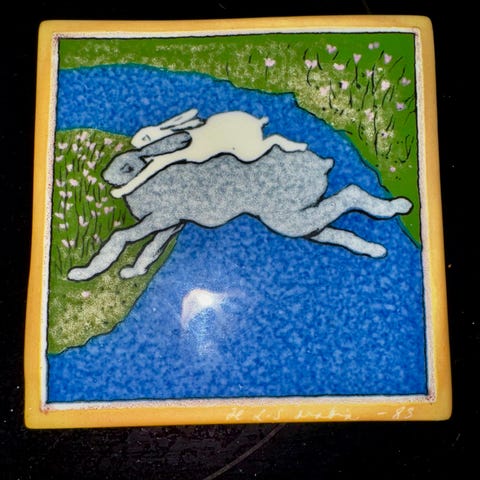 Arabian seinälaatta "Jänis pensaassa" tai "Jänis/-ten pesä". Signeerattu. Suunnittelija / design Heljä Liukko-Sundström 1982. Koko 11,5 x 11,5 cm. Ehjä ja hyväkuntoinen. Seinälle heti kiinnitettävissä.