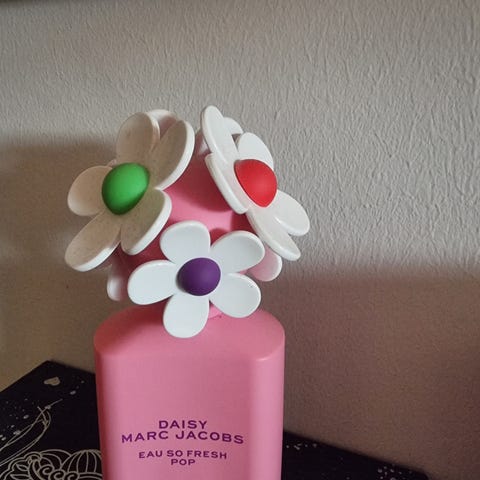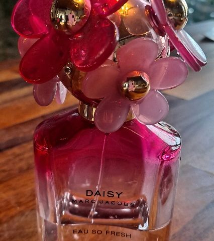 Marc Jacobs Daisy Eau So Fresh hajuvesi. Pullon materiaali lasia, koristeena kukkakoristeet. Tuoksu on kevyt ja hedelmäinen.