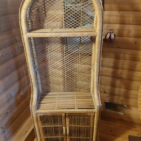 Vanha mutta hyväkuntoinen valkoinen rottinkihyllykkö. Ylätasolla pientä tummentumaa.