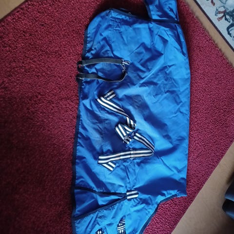 Ponin sadeloimi, koko 105 cm. Loimessa musta ja neonkeltainen/ punainen raidoitus. Materiaali sisältää sisävuoren, joka näkyy kuvissa. Sopii ponin suojaksi sateelta. Jalkalenkit, lapalaskokset. Kuin uusi, jäänyt käyttämättä. Voidaan postittaa.