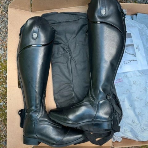Myydään Mountain Horzen Venice young rider ratsastussaappaat tuplakoossa 39-40. Laadukkaat saappaat ovat nahkaa ja varret ovat 43cm korkeat ja kapeat 33-34cm. Varsissa on takana vetoketjut.