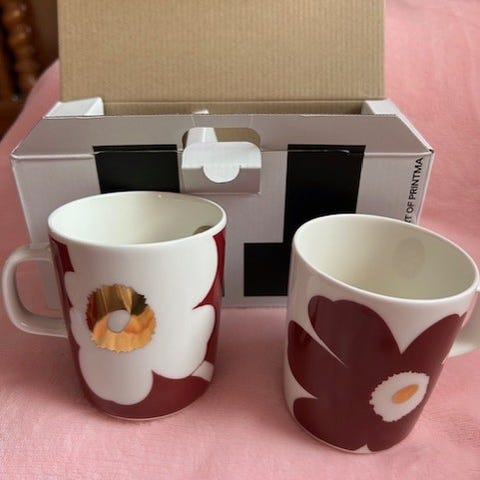 Marimekko Unikko Anniversary Oiva -sarjan kahvimukit, 2 kappaletta. Värit vaaleanpunainen, valkoinen ja kulta. Mukit on pakattu alkuperäiseen pinkkiin pakkaukseen.