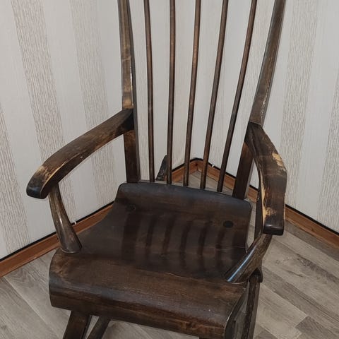 Vanha puinen keinutuoli. Muutamia kulumia, mutta edelleen hyvässä kunnossa ikäänsä nähden.