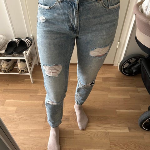 Hyväkuntoiset siniset leveälahkeiset naisten farkut joissa kuvio taka taskuissa kokoa XS.