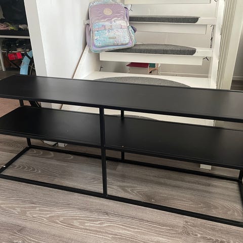 JYSKistä ostettu TV-taso laatikolla.
