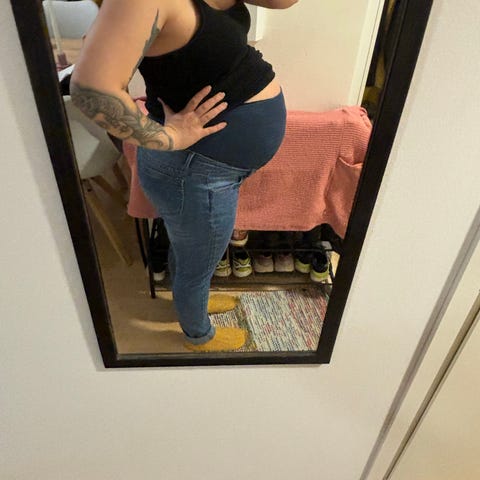 Mustat äitiysfarkut. Kokomerkintä tuumoissa 32/33, sopii noin L-XL kokoa käyttävälle odottajalle.