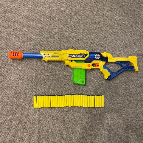 Zuru X-Shot lasten toimiva ja ehjä leikkipyssy. Mukana pyöreä lipas, joka mahdollistaa useiden laukauksien ampumisen peräkkäin. Erillisestä vivusta saa itse säädettyä, ampuuko lippaan sisä- vai ulkoreunan ammuksia. Kauppaan mukaan kuuluu kuvassa olevat panokset. (Nerf-aseen kaltainen, mutta eri valmistajan.)