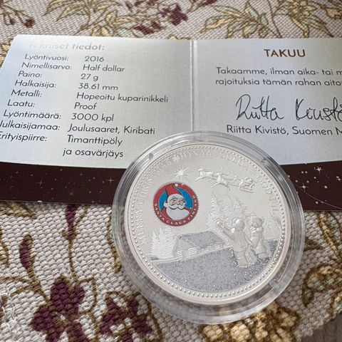 Santa Claus lahjakirje, jossa on koristeellinen ulkoasu ja punainen sinetti. Kirje on painettu paperille, joka on suunniteltu muistuttamaan vanhaa pergamenttia. Kirje sisältää jouluisen viestin Santa Clausilta. Mukana kultakolikko PORO 0,5 g 999,9 Anteeksi, että kolikon kuva on huono johtuu kamerasta ja minun valokuvaustaidosta. Kuvassa poro lumisessa maisemissa. Painettu vain 399 kpl maailman yhteistyössä joulupukkisäätiön kanssa