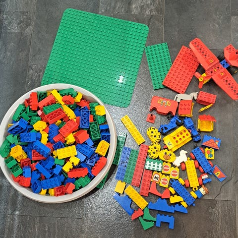 Iso kasa erilaisia Lego Duplo palikoita ja ajoneuvoja, työkoneita, lego ukkoja ja alusta.