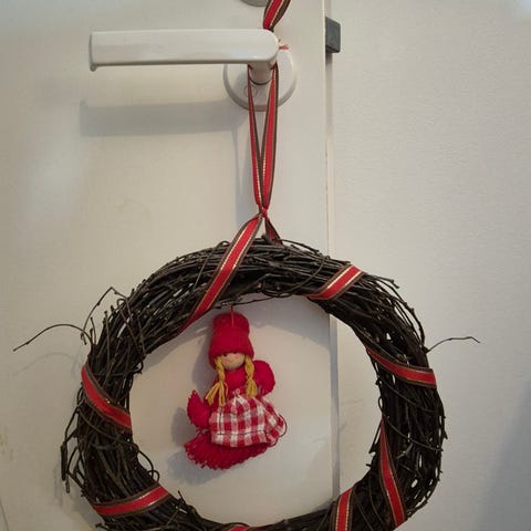 Kuvienmukainen itsetehty kranssi toissa joulun alla. Karisee jos käsittelee kovakouraisesti. Saisi ehkä pidettyä kasassa jos suihkuttaa jotain ainetta, mikä sitoo materiaalit yhteen? Nämä on aitoja materiaaleja. Jos jollain jotain käyttöä, esim tuo alla oleva ympyrä vois vielä käydä uuden kranssin tekoon? Nouto.
