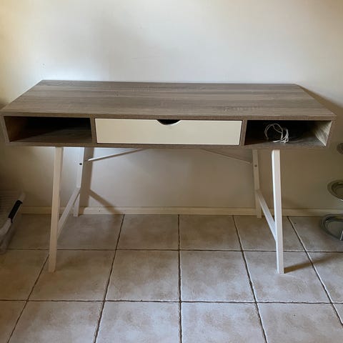 Vaaleatammi/Musta värinen työ-/koulupöytä.