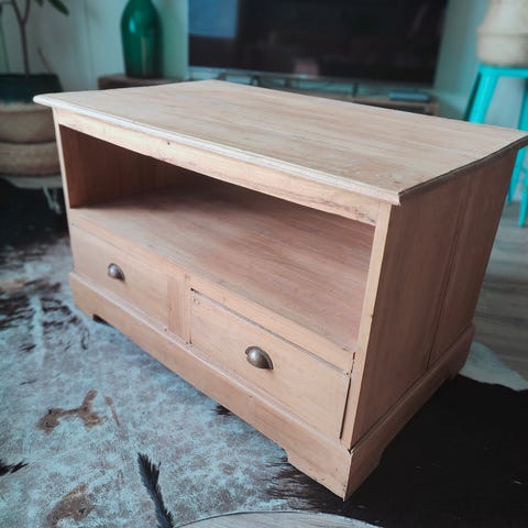 Kierrätyspuusta valmistettu ja meillä tv-tasona käytössä ollut lipasto / hyllytaso. Kuosiltaan rustiikkinen ja maalaisromanttinen. Aukot takaseinässä piuhoille.