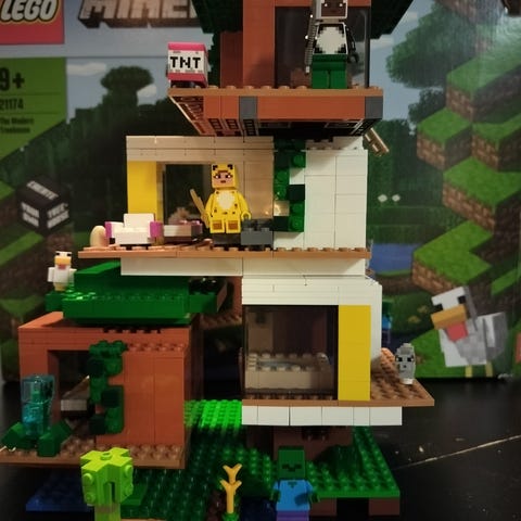 Iso, n. 900 osaa sisältävä, muunneltava rakennussetti. Maksanut uutena n. 140e. Rakennelman kaikki osat tallessa. Muutama pala korvattu vastaavilla hieman eri sävyisillä (nämä merkitty ohjekirjaan). Irto hahmot/tavarat ei kaikki ole tallessa. Mukaan tulee ainakin 2 hahmoa, kana, aarrearkku, sohva, sängyt, pari hakkua, tnt-laatikko. Mukana myös ohjekirja ja elementti erotin. Tietoa tuotteesta: https://www.lego.com/fi-fi/product/the-modern-treehouse-21174