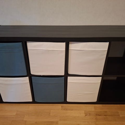 Hyvässä kunnossa oleva Ikean kallax-hylly. Laatikot eivät ole enää ihan priimakunnossa, mutta ne saa halutessaan mukaan. Kahta on tuunattu kuviokankaalla. Hylly on kaikin puolin siistissä kunnossa. Nouto Hannunniitusta.