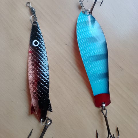 Käyttämättömiä uistimia, lipat ovat todella vanhoja ja se näkyy hieman niiden pinnassa värjäytyminä ja maalin lohkeilulla mutta niitäkään ei ikinä ole avattu pakkauksestaan.