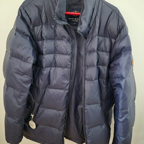Muhkea hupullinen tummansininen takki keltaisella vuorilla. Koko on L/52