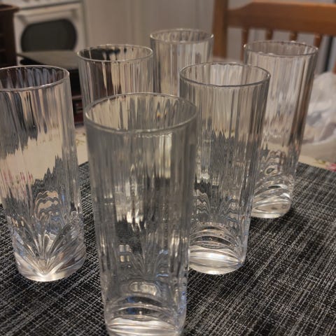 Venäläistä kristallia olevat juomalasit. Vetoisuus 1,5 dl, korkeus 10 cm ja leveys 6,5 cm.