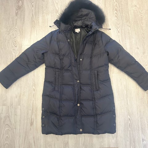 Lämmin pitkä toppatakki. Käytetty satunnaisesti. Kunto moitteeton, mutta laukun hihna 'hangannut' yhden tikkauksen auki, tästä kuva.