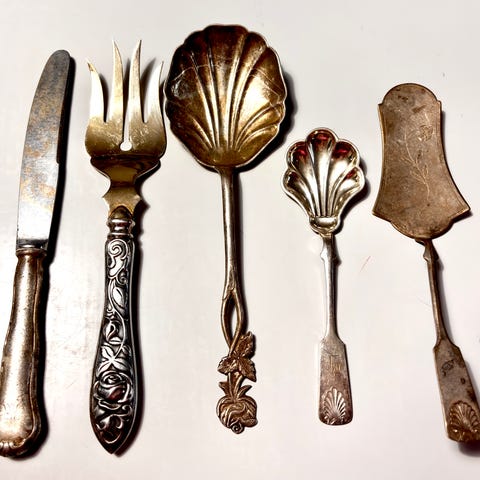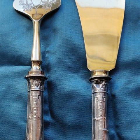 Vanhat sokeri tms. ottimet, 2kpl, mekaniikka toimii, mutta kankeasti + hedelmäveitsi hopea/hopeoidulla kahvalla. ruusukuvio.