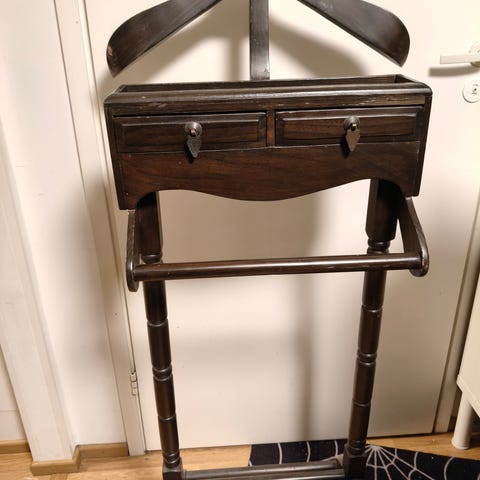 Jämäkkä vaateteline, säädettävät jalkatapit. Nouto Kaukovainiolta.