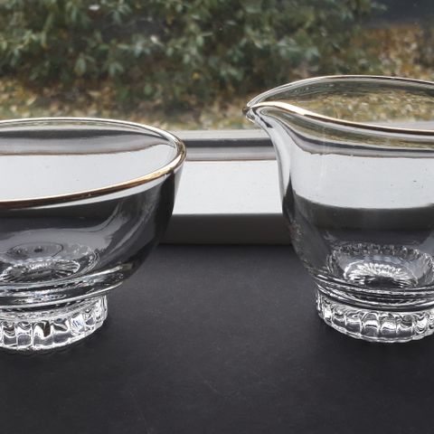Kauniit ja hyväkuntoiset perinteinen sokerikko ja kermakko pari. Valmistaja Karhulan lasi 1949 luvulla. Nouto tai postitus.