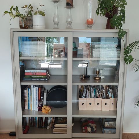 Ikean Havsta vitriinikaappi sokkelilla. Lasiset veto-ovet ja tasot. Kuin uusi.