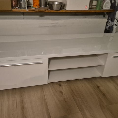 - Valkoinen, tyylikäs TV-taso integroidulla lasitasolla ja LED-valaistuksella – antaa kevyen ja modernin ilmeen.