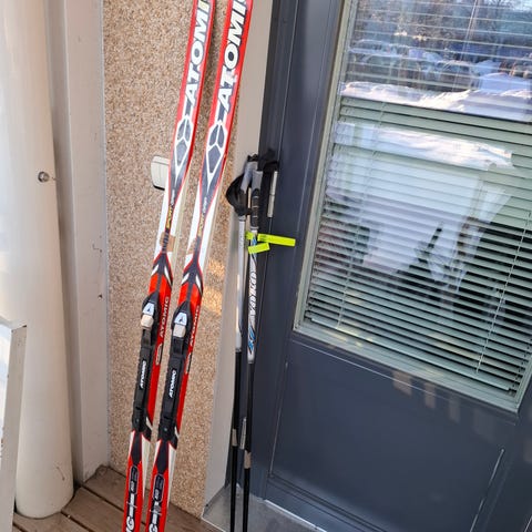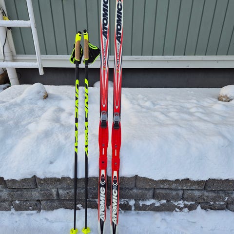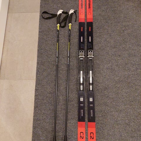 Lähinnä kouluhiihdossa käytössä olleet 160 cm pitkät Atomic Pro C2 -sukset, sauvat ja koon 37 Alpina-monot. Sopii 40-50 kg lapselle.
