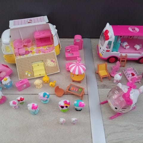 Ihana Hello Kitty leikkisetti! Sisältää useita pieniä leikkihuonekaluja ja hahmoja. Yhden talon palmusta puuttuu pää.