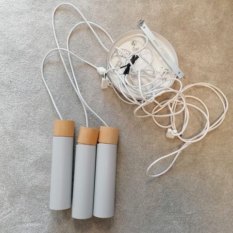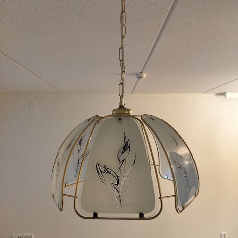 Riippuvalaisin, jossa on kuusi kynttelikköä. Valaisin on suunniteltu kattoon ripustettavaksi ja siinä on koristeellinen muotoilu.
