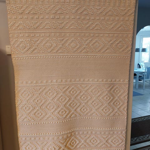 Hyvässä kunnossa oleva seinävaate, menee varmasti muuhunkin tarkoitukseen. Materiaali vaikuttaa villalta. Yläreunassa kuja ripustusta varten.