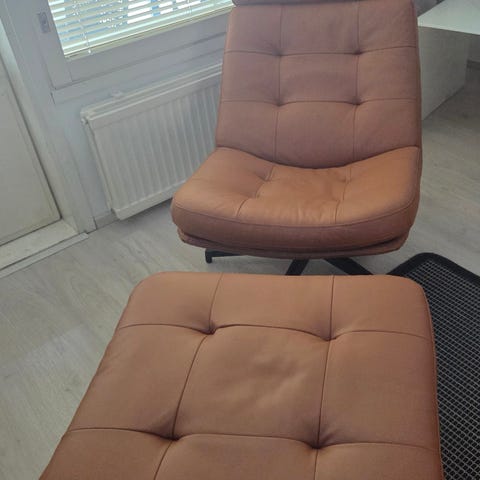 Tanskalaisen Hjort Knudsenin nahkainen sohvaryhmä. Kokonaisuus koostuu kolmen istuttavasta sohvasta, nojatuolista ja rahista. Sohvassa irrotettavat niskatyynyt.