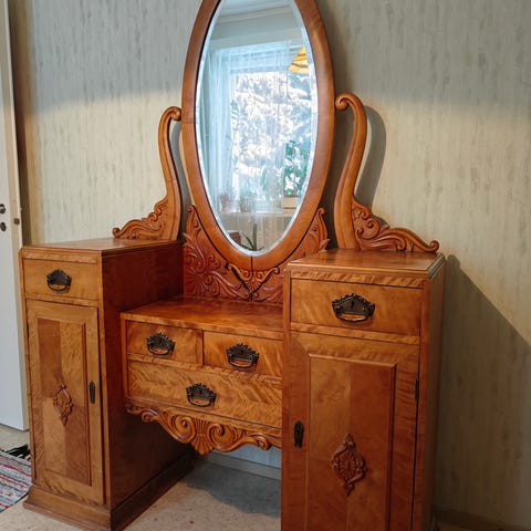Hyvässä kunnossa oleva retro lipasto. Yhdessä laatikossa sisällä hieman värjäytymään. Avain kateissa, mutta lukolliset laatikot saapi auki.