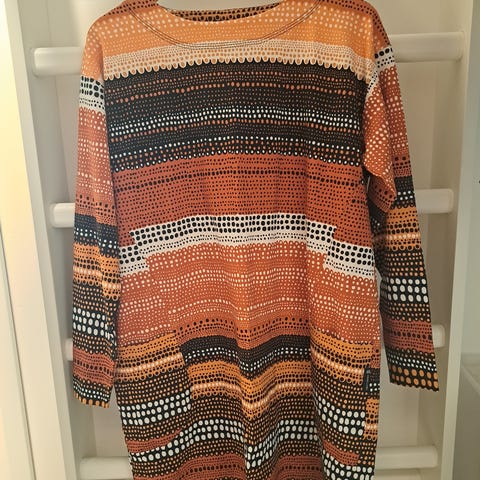 Ommellinen trikootunika. A-linjainen malli, taskut, lyhyet hihat.