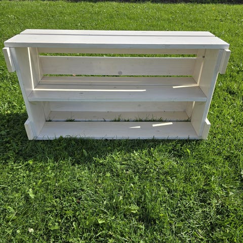 Puinen lokerikko, väri harmaa. Meillä käytetty kenkätelineenä.