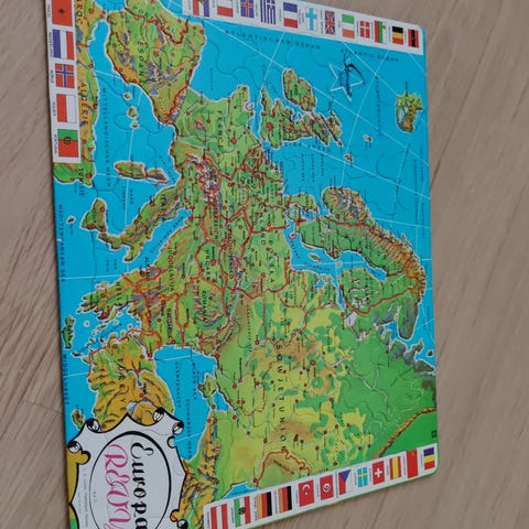 Myydään 1970-luvulta peräisin oleva Norden kartta palapeli, jossa on Pohjoismaiden alueet ja vaakunat. Palapelin kuvituksessa näkyy maantieteelliset yksityiskohdat ja historiallisia symboleja eri maista.