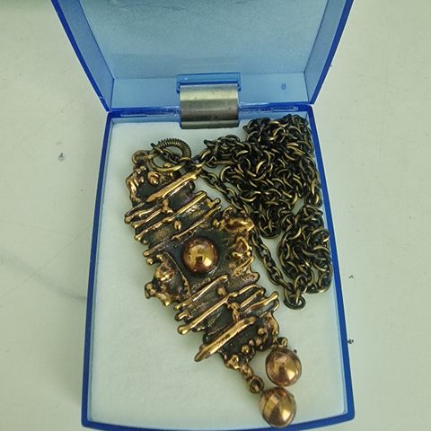 Käytössä ollut P. Sarpanevan suunnittelema pronssinen kaulakoru. Ketjun pituus n. 65 cm. Rasiaa ei ole. Pakettiautomaattilähetys Manner-Suomeen 6 euroa, josta saa lähetyksen seurantanumeron. Nouto Kuopiosta keskustasta. En käytä ToriDiiliä.
