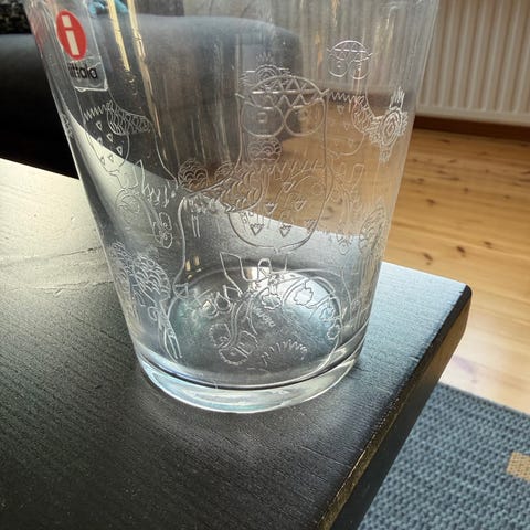 Iittalan Taika Sato Tumbler uudet juomalasit kirkasta lasia, vetoisuus 3 dl. Yläreunassa Iittalan pieni, pyöreä, punainen logo ja pohjassa valkoinen iittala-merkki. (kuva 3) Klaus Haapaniemen suunnittelema, lasiin kaiverrettu pöllökuvio, mikä erottuu hieman heikosti. (siis minun mielestäni) Lasin korkeus noin 9,5 cm, halkaisija ylhäältä noin 8,5 cm ja pohjasta noin 6,3 cm, konepesun kestävä. Myynnissä 8 uutta lasia yhdessä tai erikseen, € 15/kappale.