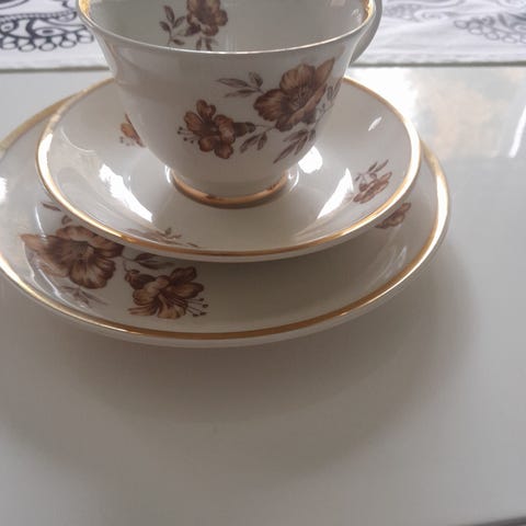 Erittäin hyväkuntoinen Myrna kahviastiasto, aina käsinpestyt, kultaukset hyväkuntoiset, ei lohkeamia, vain juhlakattauksessa käytetyt.