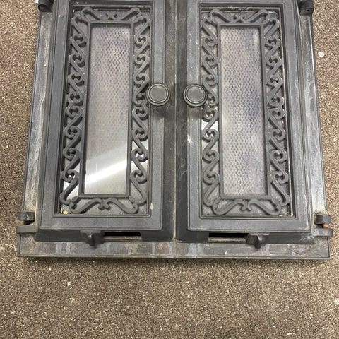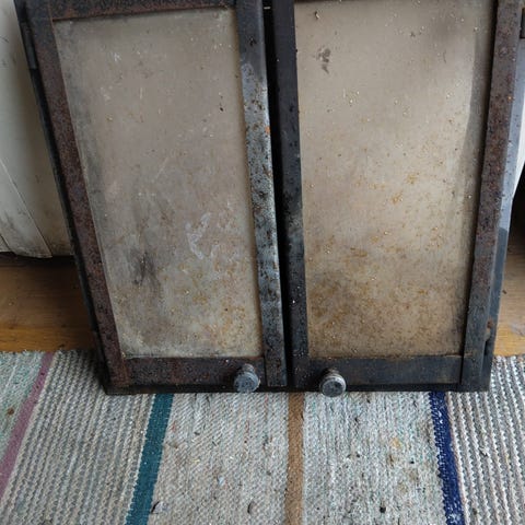 Vanha takkaluukku kipinäverkolla, värinä hieno ja hieman vuosien varrella patinoitunut messinki