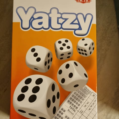Yatzy lautapeli, joka sisältää viisi valkoista noppaa. Sopii 5 vuotta täyttäneille ja vanhemmille pelaajille.
